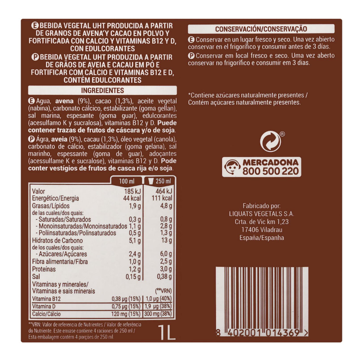 Csokoládé ízű zabital 1L – hozzáadott cukor nélkül Hacendado