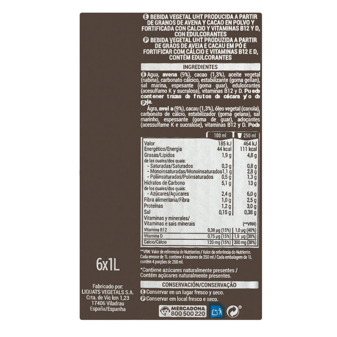 Csokoládé ízű zabital 6x1L – hozzáadott cukor nélkül Hacendado