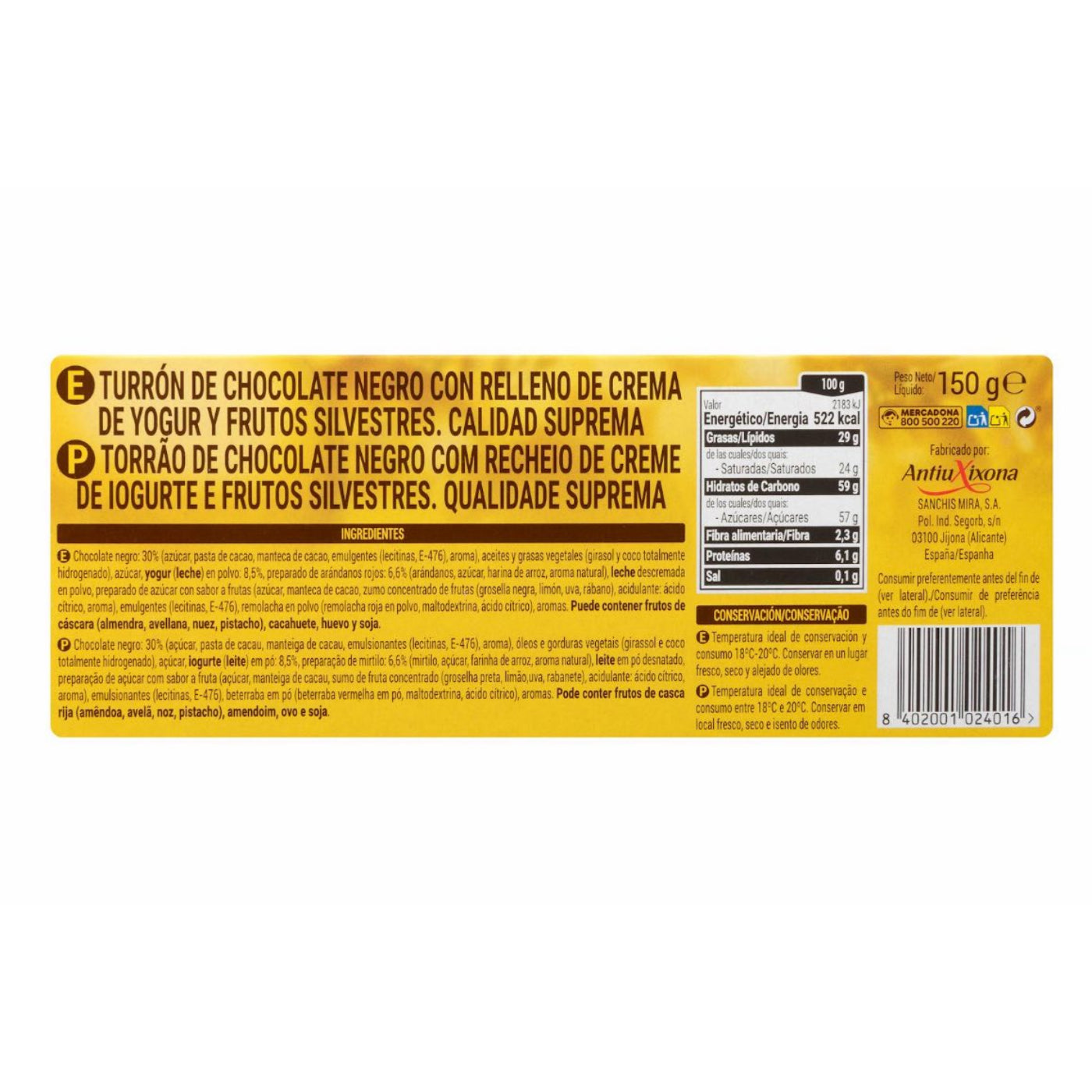 Étcsokoládé 30% (cukor, kakaómassza, kakaóvaj, emulgeálószerek: lecitinek, E-476, aroma), növényi olajok és zsírok (napraforgó és teljesen hidrogénezett kókusz), cukor, joghurtpor (tej) 8,5%, vörösáfonya-készítmény 6,6% (vörösáfonya, cukor, rizsliszt, természetes aroma), sovány tejpor, gyümölcsízű cukorkészítmény (cukor, kakaóvaj, gyümölcskoncentrátumok – feketeribizli, citrom, szőlő, retek –, savanyúságot szabályozó anyag: citromsav, aroma), emulgeálószerek (lecitinek, E-476), céklapor (vöröscéklapor, maltodextrin, citromsav), aromák.