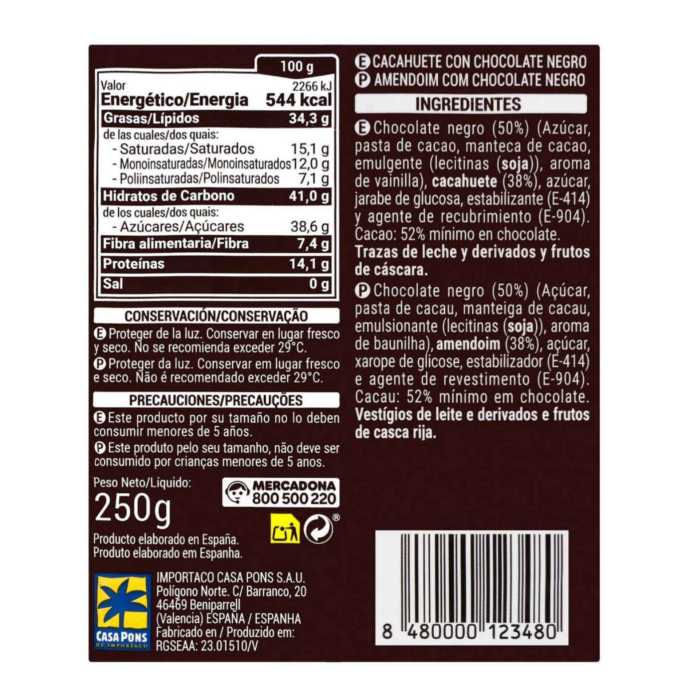 Étcsokoládé (50%) (cukor, kakaómassza, kakaóvaj, emulgeálószer: lecitinek (szója); vanília-aroma), földimogyoró (38%), cukor, glükózszirup, stabilizátor (E-414), bevonóanyag (E-904).
