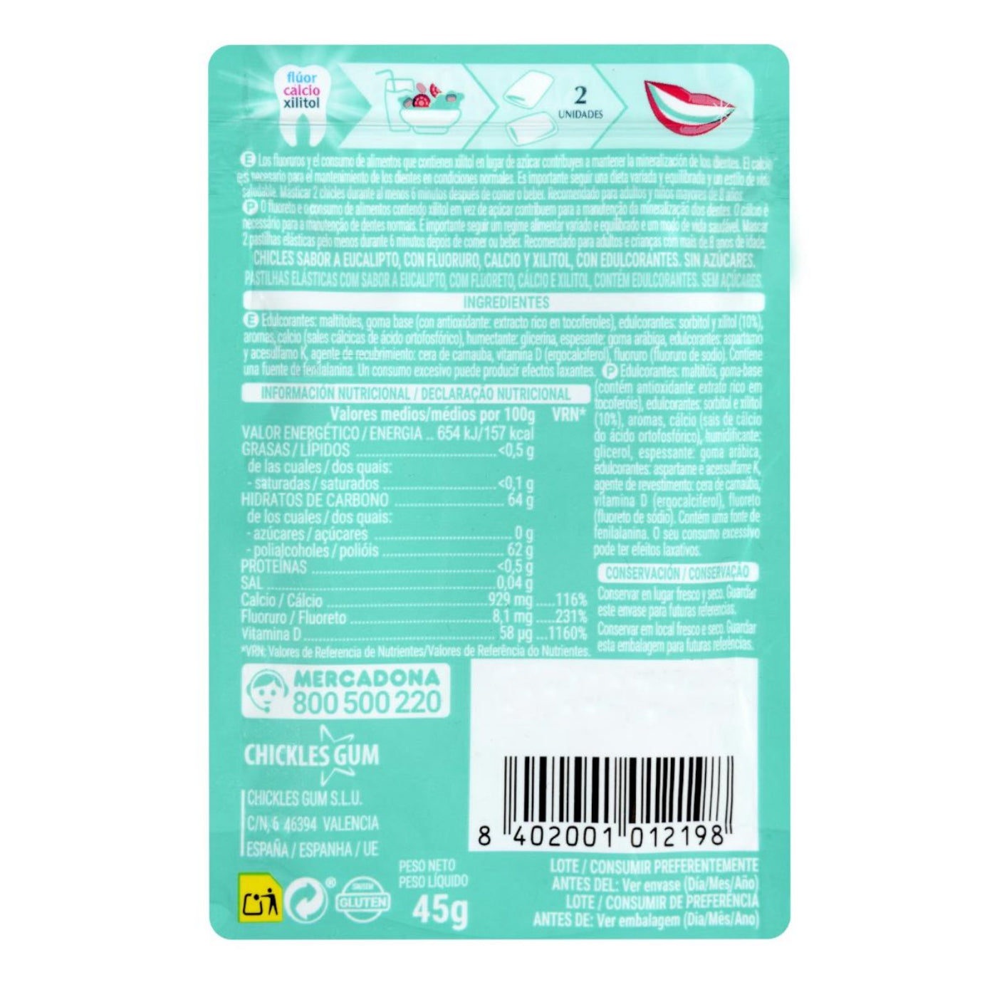 Glutén- és cukormentes eukaliptuszos rágógumi fluorral, kalciummal, xilitolal