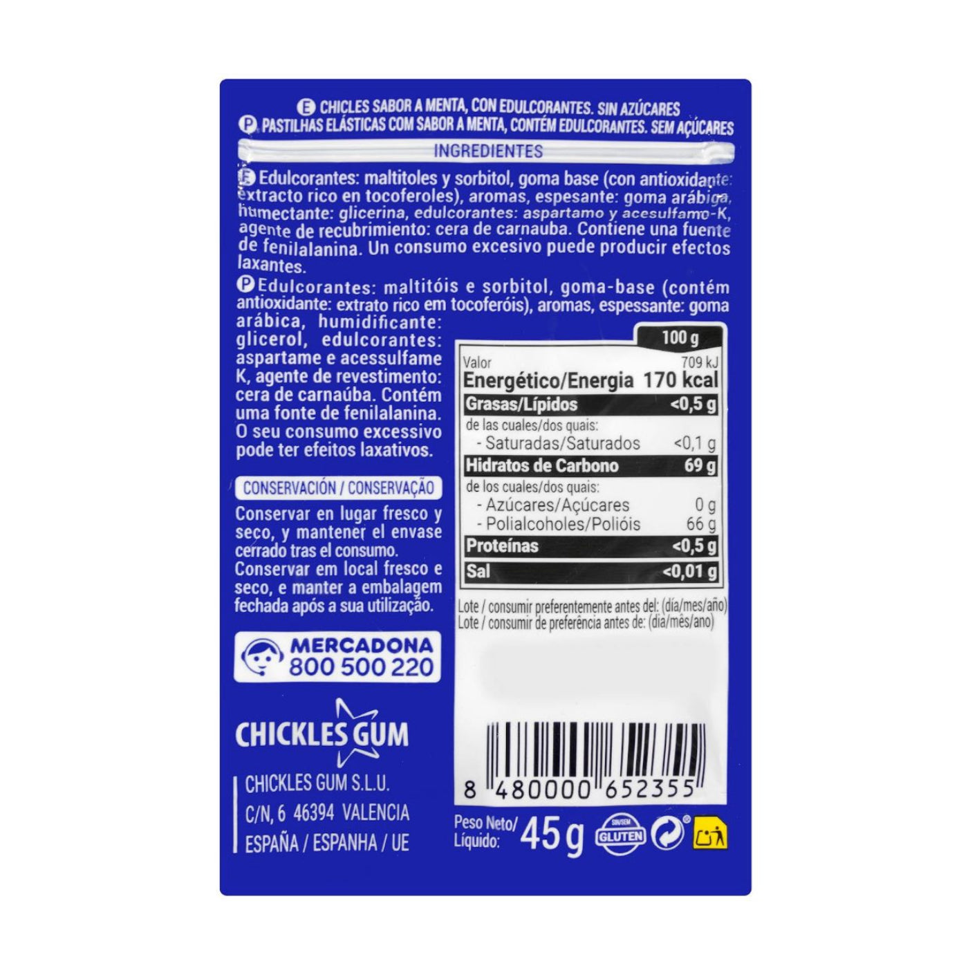 Édesítőszerek: maltitol és szorbit, rágógumi alap (antioxidánssal: tokoferolban gazdag kivonat), aromák, sűrítőanyag: arabgumi, nedvesítőszer: glicerin, édesítőszerek: aszpartám és aceszulfám-K, bevonatszer: karnaubaviasz. Fenilalanin-forrást tartalmaz. A túlzott fogyasztás hashajtó hatású lehet.