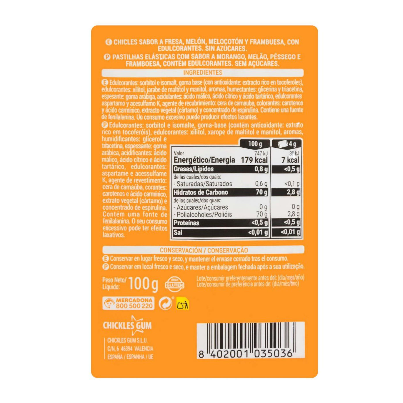 Édesítőszerek: szorbit és izomalt; rágógumialap (antioxidánssal: tokoferolokban gazdag kivonat); édesítőszerek: xilit, maltit-szirup és mannit; aromák; nedvesítőszer: glicerin és triacetin; sűrítőanyag: arabgumi; savanyúságot szabályozó anyagok: almasav, citromsav és borkősav; édesítőszerek: aszpartám és aceszulfám-K; bevonóanyag: karnaubaviasz; színezékek: karotinok és kárminsav; növényi kivonat (pórsáfrány); spirulina-koncentrátum. Fenilalanin-forrást tartalmaz. Túlzott fogyasztása hashajtó hatású lehet.