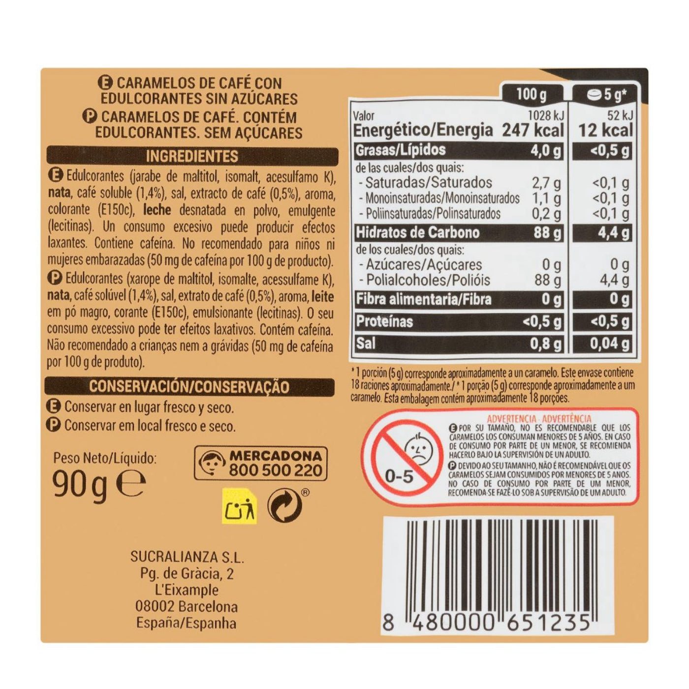 Édesítőszerek (maltit-szirup, izomalt, aceszulfám-K), tejszín, instant kávé (1,4%), só, kávékivonat (0,5%), aroma, színezék (E150c), sovány tejpor, emulgeálószer (lecitinek). A túlzott fogyasztás hashajtó hatású lehet. Koffeint tartalmaz. Nem ajánlott gyermekeknek és várandós nőknek (100 g termékben 50 mg koffein).