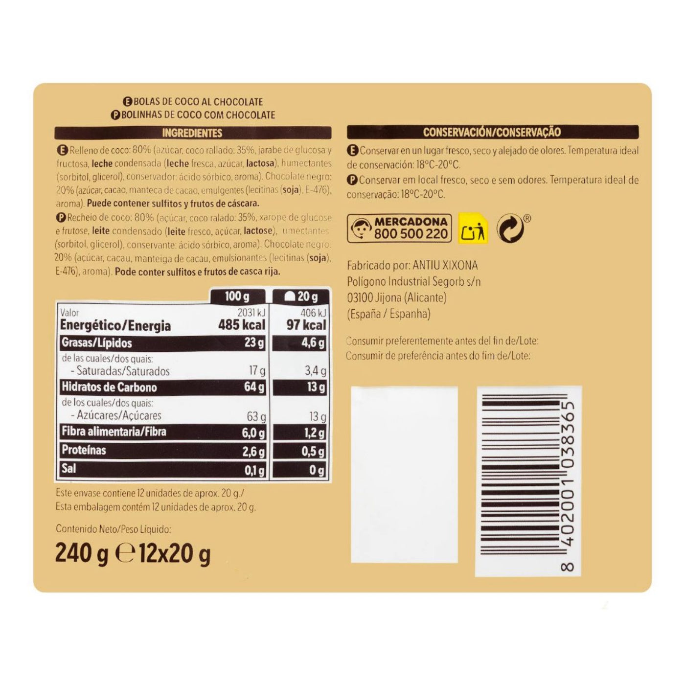 Kókuszos töltelék (80%) (cukor, reszelt kókusz (35%), glükóz-fruktózszirup, sűrített tej (friss tej, cukor, laktóz), nedvesítőszerek: szorbit, glicerin; tartósítószer: szorbinsav; aroma), étcsokoládé (20%) (cukor, kakaó, kakaóvaj, emulgeálószerek: lecitinek (szója), E476; aroma). Tartalmazhat szulfitokat és dióféléket.