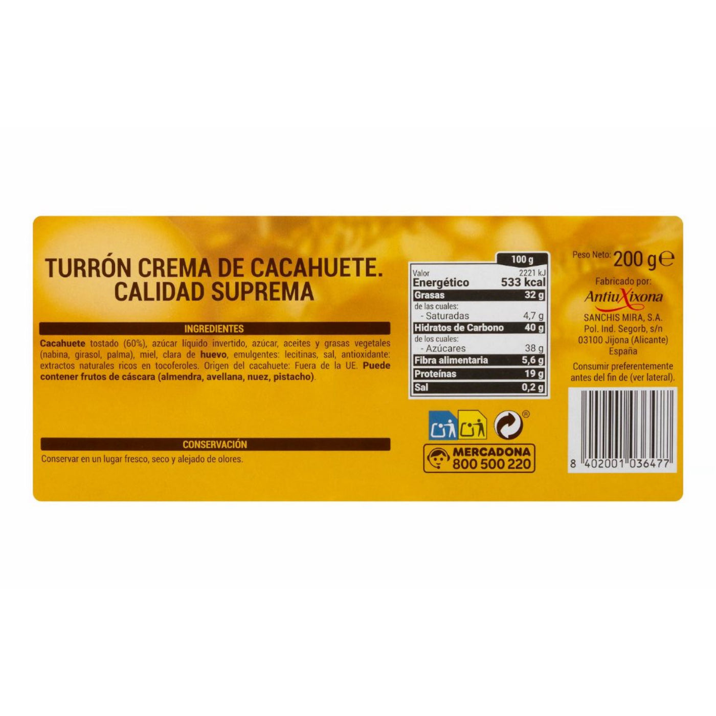 Pörkölt földimogyoró (60%), invertált folyékony cukor, cukor, növényi olajok és zsírok (repce, napraforgó, pálma), méz, tojásfehérje, emulgeálószerek: lecitinek, só, antioxidáns: természetes tokoferolokban gazdag kivonatok. A földimogyoró származási helye: EU-n kívül. Nyomokban dióféléket (mandula, mogyoró, dió, pisztácia) tartalmazhat.