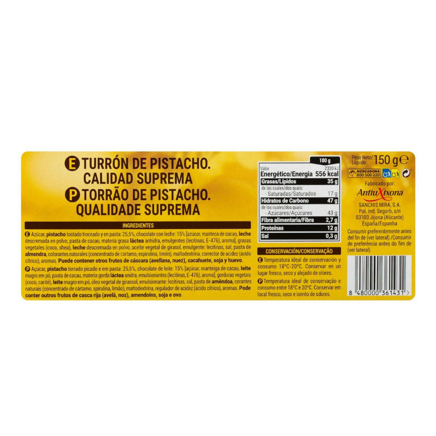 Cukor, pörkölt pisztácia (apróra vágott és paszta) 25,5%, tejcsokoládé: 15% (cukor, kakaóvaj, sovány tejpor, kakaópaszta, tejzsír, emulgeálószerek (lecitin, E-476), aroma), növényi zsírok (kókusz, shea), sovány tejpor, napraforgóolaj, emulgeálószer: lecitin, só, mandulapaszta, természetes színezékek (sárkafű-koncentrátum, spirulina, citrom), maltodextrin, savanyúságot szabályozó anyag (citromsav), aromák. Nyomokban más dióféléket (mogyoró, dió), földimogyorót, szóját és tojást tartalmazhat.