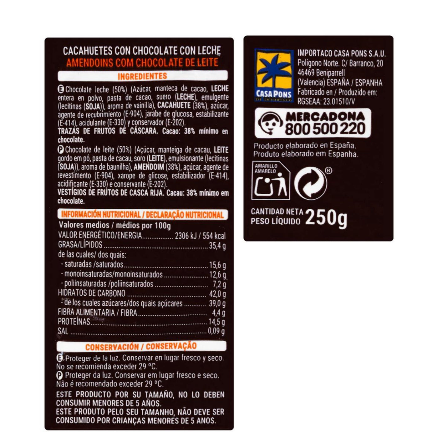 Tejcsokoládé (50%) (cukor, kakaóvaj, teljes tejpor, kakaómassza, tejsavópor (tej), emulgeálószer: szójalecitin, vanília aroma), földimogyoró (38%), cukor, bevonóanyag (E904), glükózszirup, stabilizátor (E414), savanyító anyag (E330), tartósítószer (E202).