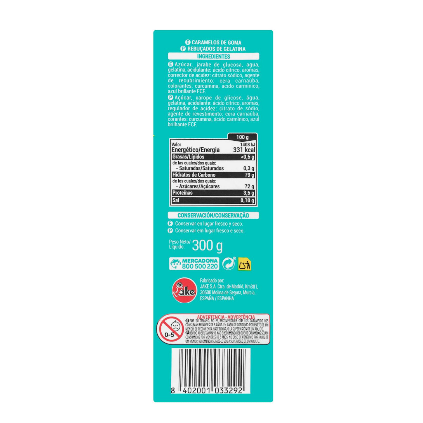 Cukor, glükózszirup, víz, zselatin, savanyító: citromsav, aromák, savanyúságot szabályozó anyag: nátrium-citrát, bevonóanyag: karnaubaviasz, színezékek: kurkumin, kárminsav, briliánskék FCF